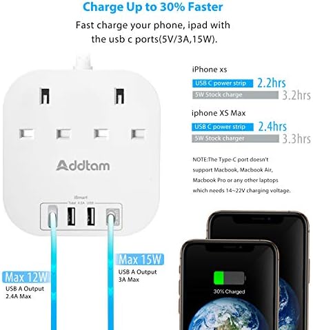【USB C Fast Charge】- 4 USB ports total 4.5A, each USB A port featuring 2.4A Max output. USB C charging port 3A MAX, and come with smart charging technology detects your connected USB devices and adjusts current output for the optimal charge which can reach faster charging efficiency. NOTE:The USB C port doesn’t support Macbook, Macbook Air, Macbook Pro or any other laptops which needs 14~22V charging voltage.